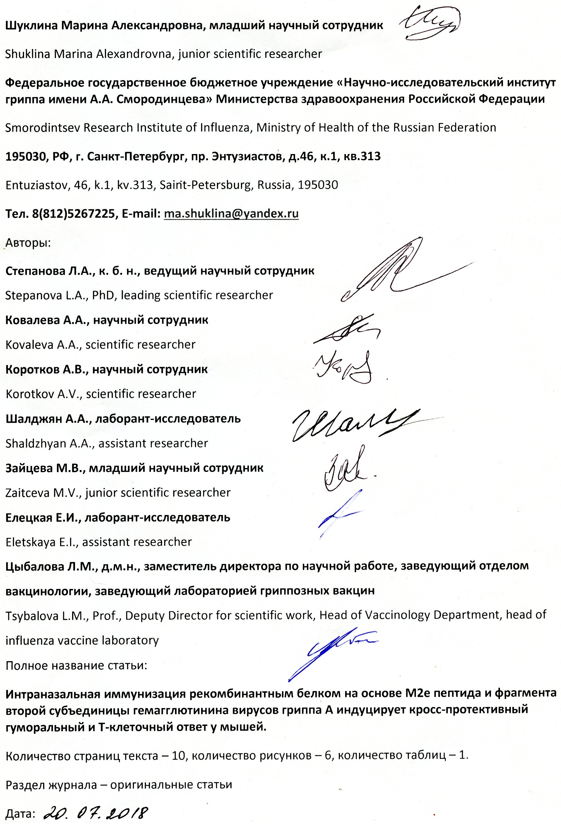 38. Stepanova L.A., Mardanova E.S., Shuklina M.A. Flagellin-fused protein targeting M2e and HA2 induces potent humoral and T-cell responses and protects mice against various influenza viruses a subtypes. J. Biomed. Sci., 2018, Vol. 25, no. 1, p. 33.