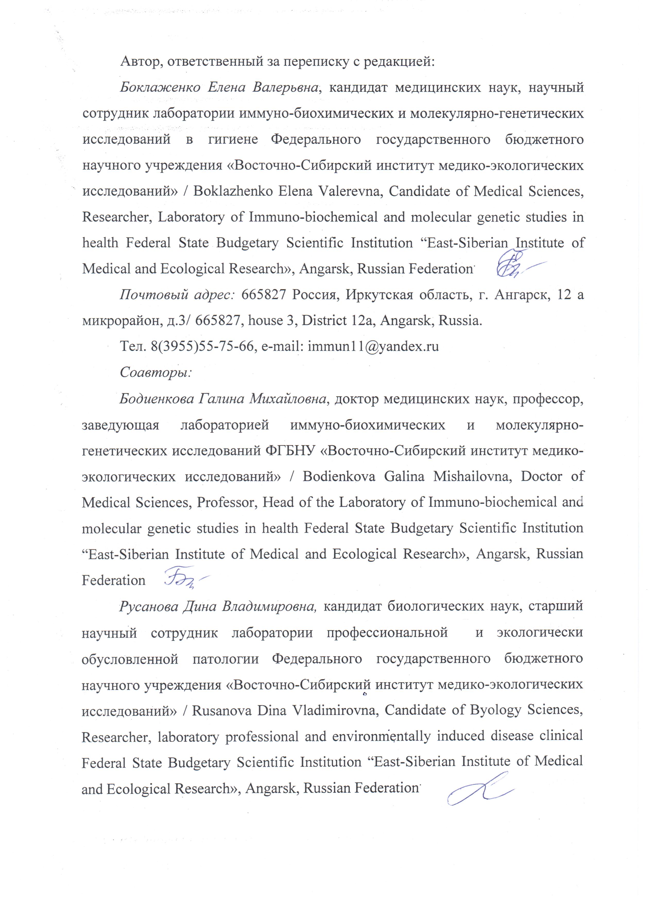 Боклаженко Елена Валерьевна — кандидат медицинских наук, научный сотрудник лаборатории иммуно-биохимических и молекулярногенетических исследований в гигиене.