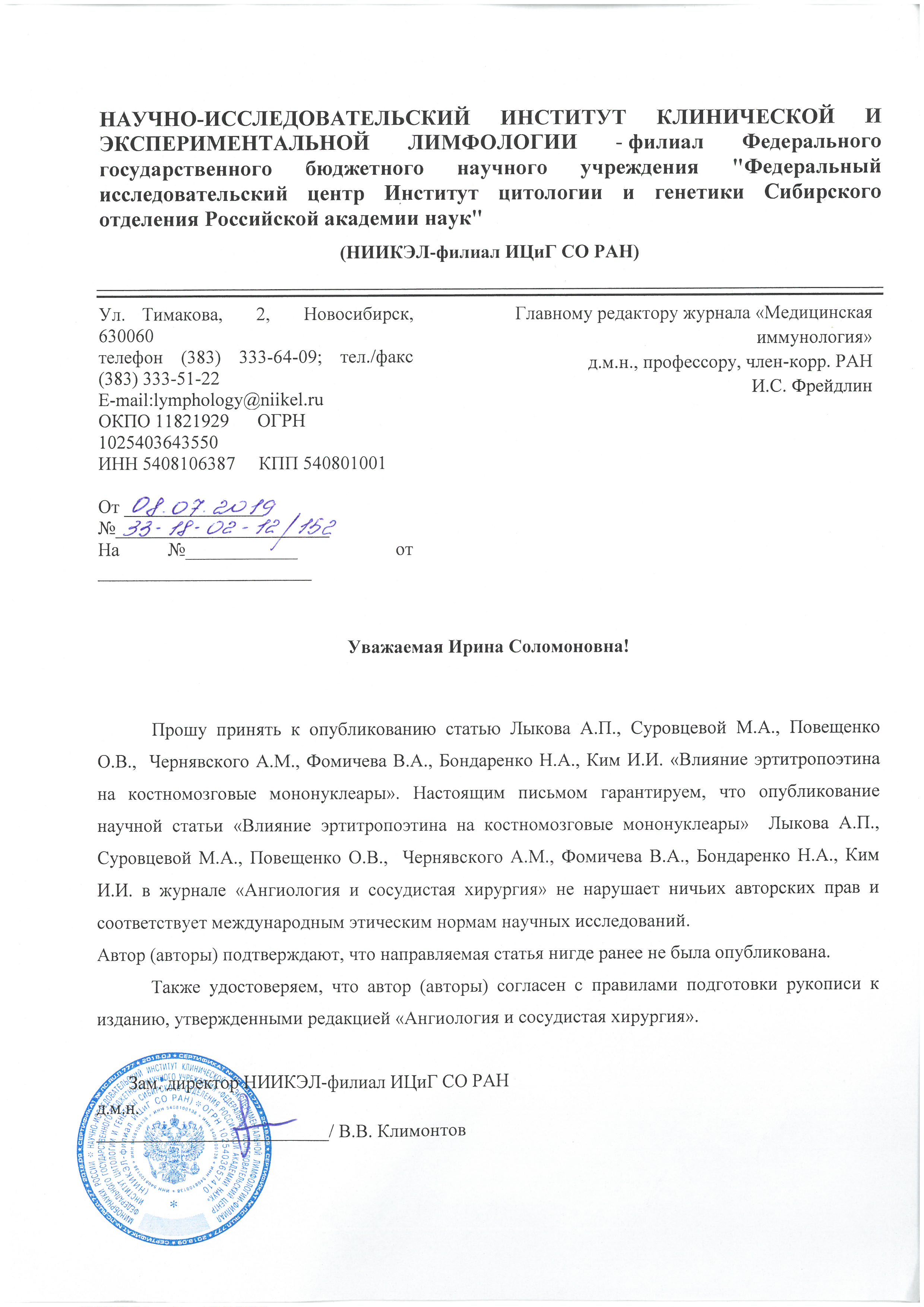 Лыков А.П. – к.м.н., ведущий научный сотрудник; старший научный сотрудник