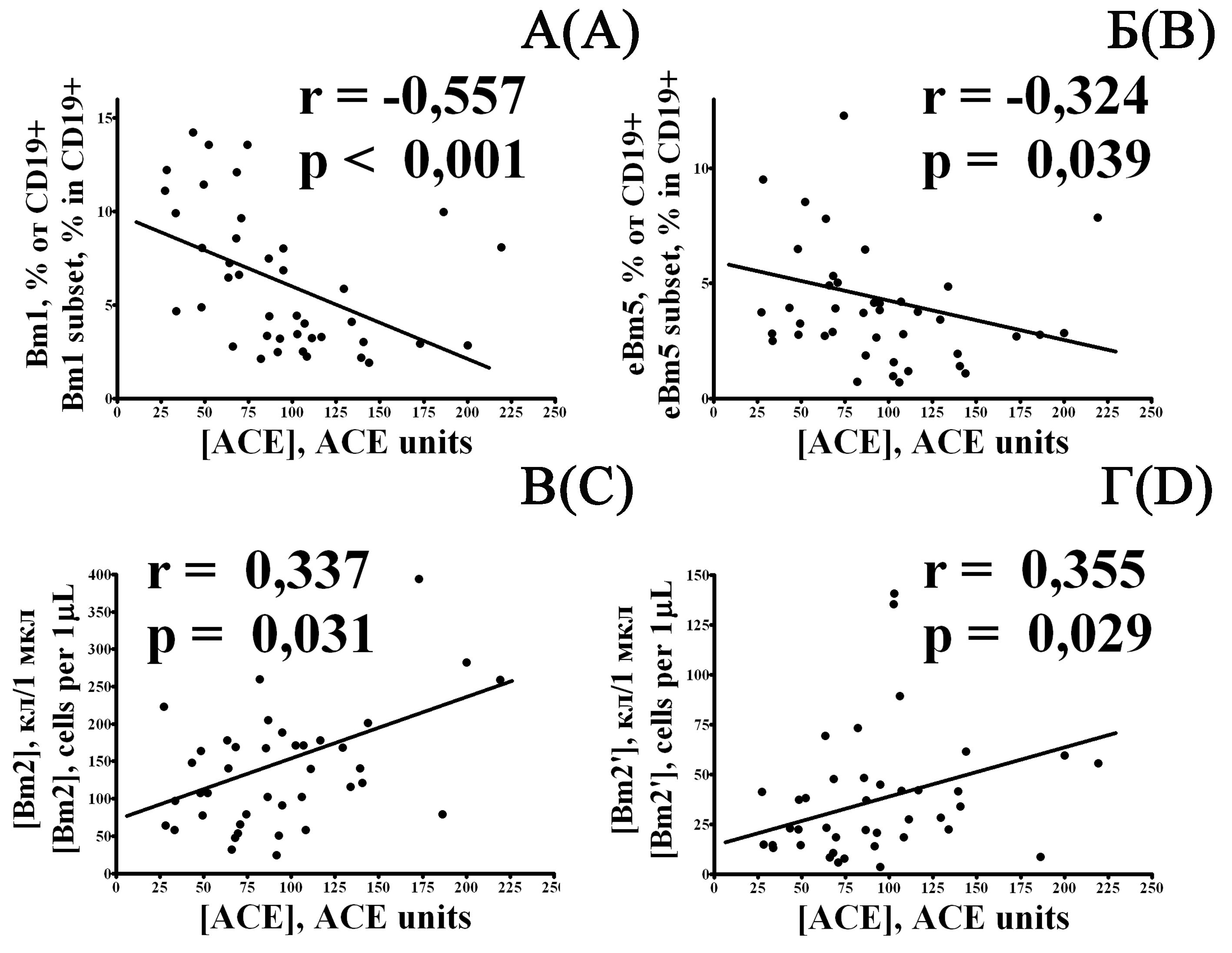 Саркоидоз — воспалительное заболевание неизвестной этиологии, характеризующееся формированием эпителиоидно-клеточных гранулем без некроза в результате гиперактивации разных клеток иммунной системы. Роль гуморальных механизмов в патогенезе саркоидоза менее изучена по сравнению с клеточно-опосредованными. Необходимо изучение роли активации или, напротив, анергии В-звена иммунитета при саркоидозе, степени его активности и особенностей клинического течения заболевания. Целью данного исследования явилось изучение особенностей субпопуляций В-лимфоцитов в периферической крови больных с хроническим течением (n = 41) саркоидоза в зависимости от активности заболевания. Контролем служили образцы периферической крови, полученные от 43 условно здоровых добровольцем. Для определения активности заболевания использовались объективные клинические и инструментальные критерии, в качестве лабораторного показателя — уровень активности АПФ (ангиотензин-конвертирующий фермент). С использованием многоцветной проточной цитометрии определялись В-лимфоциты на основе двух подходов: экспрессии IgD/CD38 (“Bm1-Bm5” классификация) и IgD/CD27. Было показано, что у больных саркоидозом было достоверно выше относительное число Bm2 "активированных "наивных" клеток" (IgD+CD38+), чем у условно здоровых лиц, 65,38% против 55,66% (р < 0,001). Относительное и абсолютное содержание eBm5 (IgD-CD38+) и Bm5 (IgD-CD38+) клеток памяти было достоверно ниже в группе больных саркоидозом относительно группы контроля. Относительные значения: 6,59% против 13,31% (р < 0,001) и 3,43% против 8,49% (р < 0,001) соответственно. Показано, что при повышенном уровне АПФ в периферической крови больных достоверно снижено число "наивных" Bm1-клеток (IgD+CD38-), г = -0,557 при р < 0,001. Относительное содержание В-клеток памяти, не переключивших класс синтезируемых антител (IgD+CD27+), в группе больных было снижено и составило 6,25%, а в группе контроля — 12,95% (р < 0,001). Число клеток памяти, переключивших класс синтезируемых антител (IgD-CD27+), было также существенно снижено у больных саркоидозом и составило 6,75% против 16,50% в контрольной группе (р < 0,001). У больных с высоким уровнем АПФ отмечалось повышение относительного содержания "наивных" В-клеток (IgD+CD27-), r = 0,532 при р < 0,001. Между числом В-клеток памяти (IgD+CD27+) и показателями уровня АПФ была установлена обратная зависимость, г = -0,565 при р < 0,001. Полученные данные свидетельствуют о важной роли В-клеточного иммунного ответа в патогенезе саркоидоза и дают возможность оценить особенности гуморального ответа при разной степени активности заболевания.