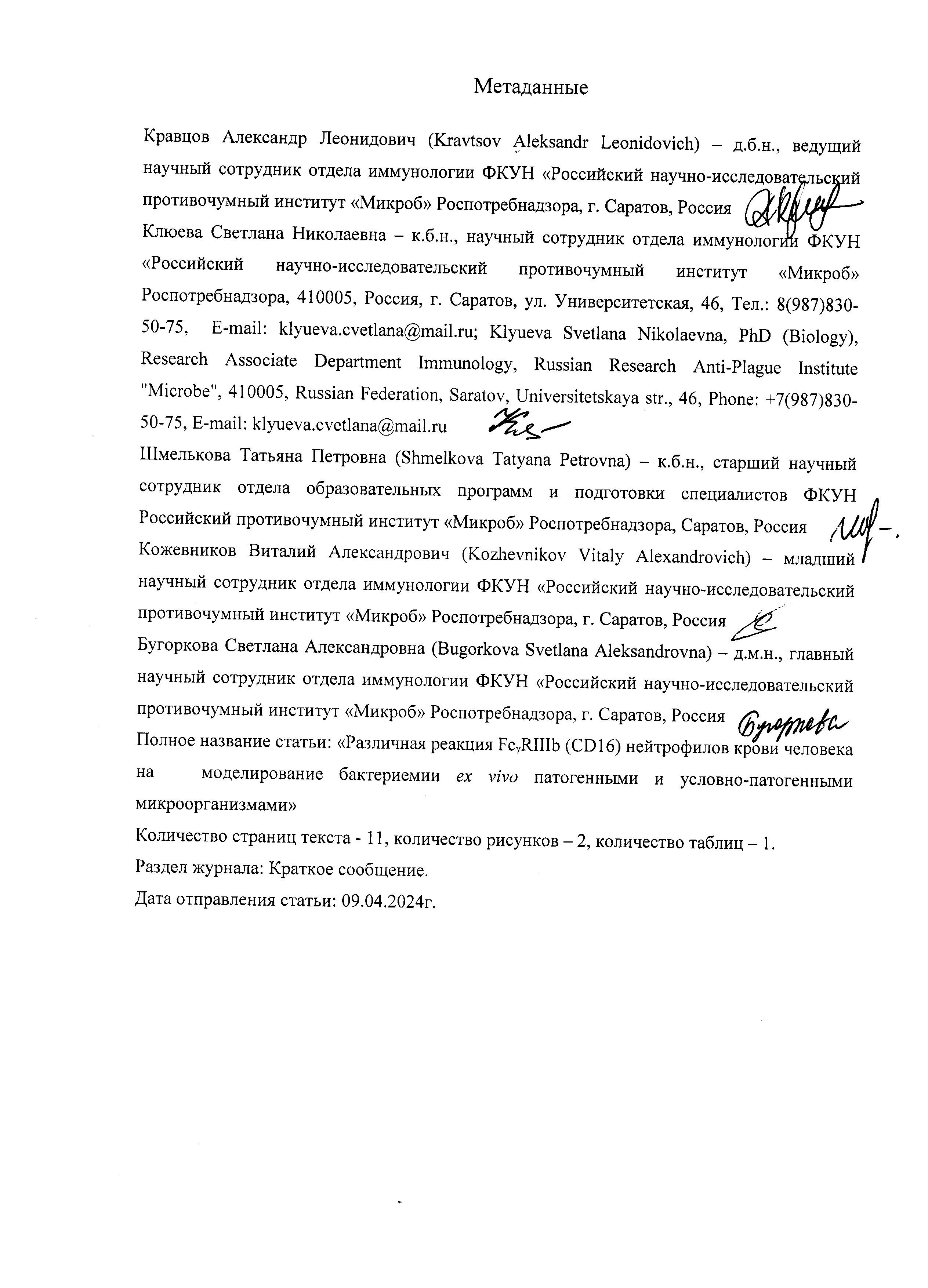 2. Кравцов А.Л., Бугоркова С.А., Клюева С.А., Шмелькова Т.П., Кожевников В.А. Оценка изменений фенотипа, интенсивности дегрануляции, гибели и лизиса нейтрофилов при моделировании ex vivo стафилококковой бактериемии. Журнал Микробиологии, Эпидемиологии и Иммунобиологии, 2023. Т.100, №4. С.293-305. [Kravtsov A.L., Bugorkova C.A., Klyueva S.N., Shmelkova T.P., Kozhevnikov V.A. Assessment of changes in the phenotype, intensity of degranulation, death and lysis of neutrophils in ex vivo modeling of Staphylococcal bacteremia. Zhurnal mikrobiologii, epidemiologii i immunologii = Journal of Microbiology, Epidemiology and Immunobiology, 2023; Vol.100, no.4, pp. 293-305 (in Russ.] doi: https://doi.org/10.36233/0372-9311-384.