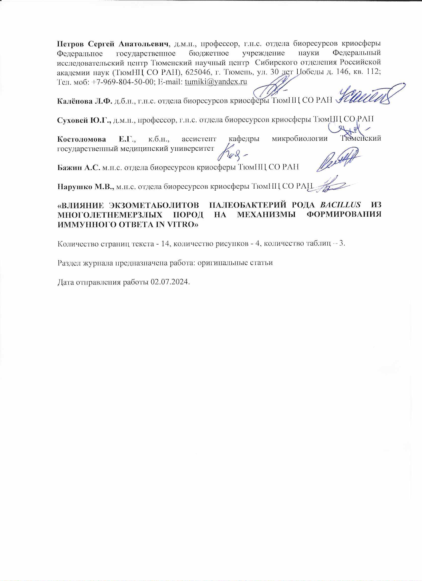 ВЛИЯНИЕ ЭКЗОМЕТАБОЛИТОВ ПАЛЕОБАКТЕРИЙ РОДА BACILLUS ИЗ МНОГОЛЕТНЕМЕРЗЛЫХ ПОРОД НА МЕХАНИЗМЫ ФОРМИРОВАНИЯ ИММУННОГО ОТВЕТА IN VITRO